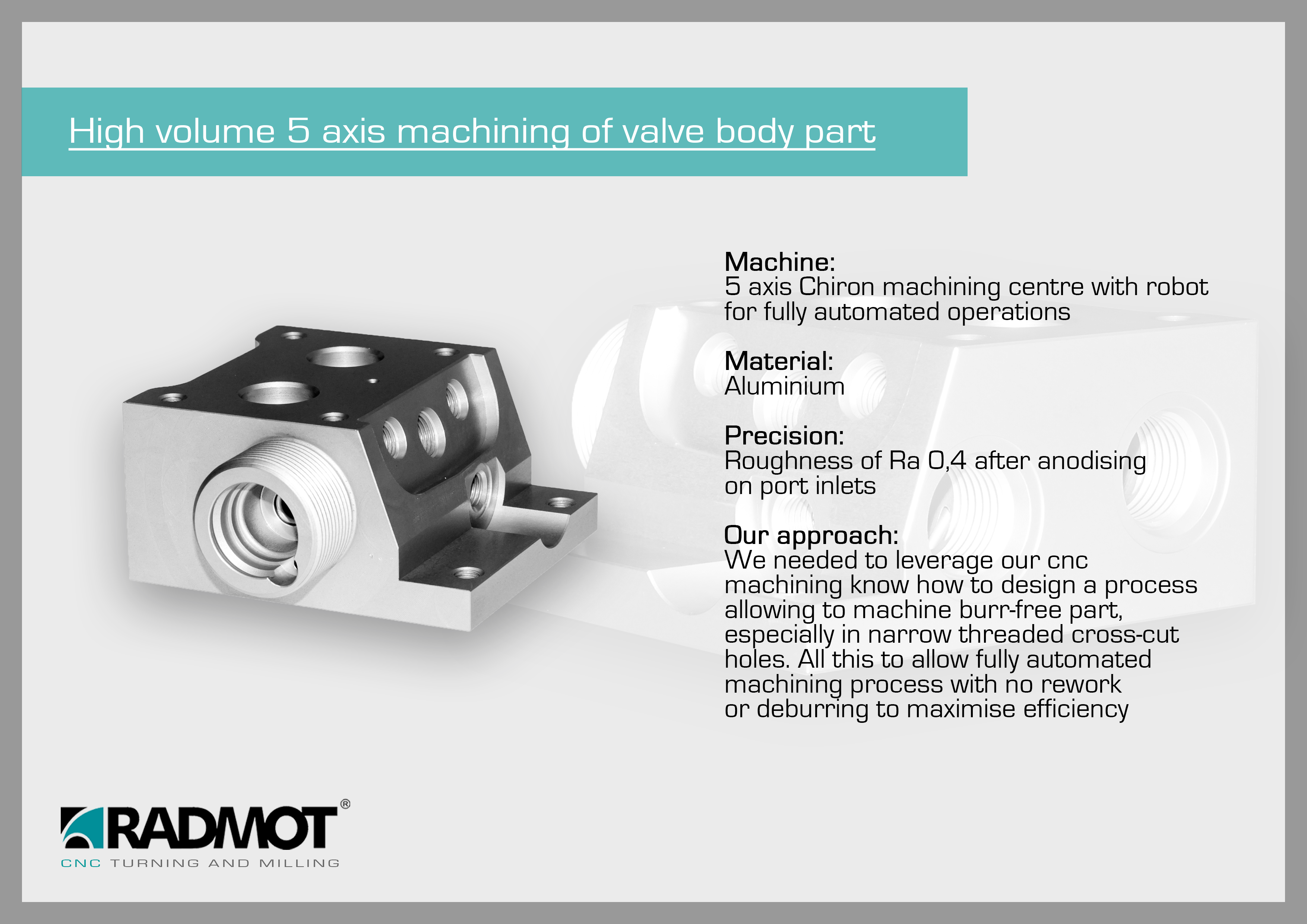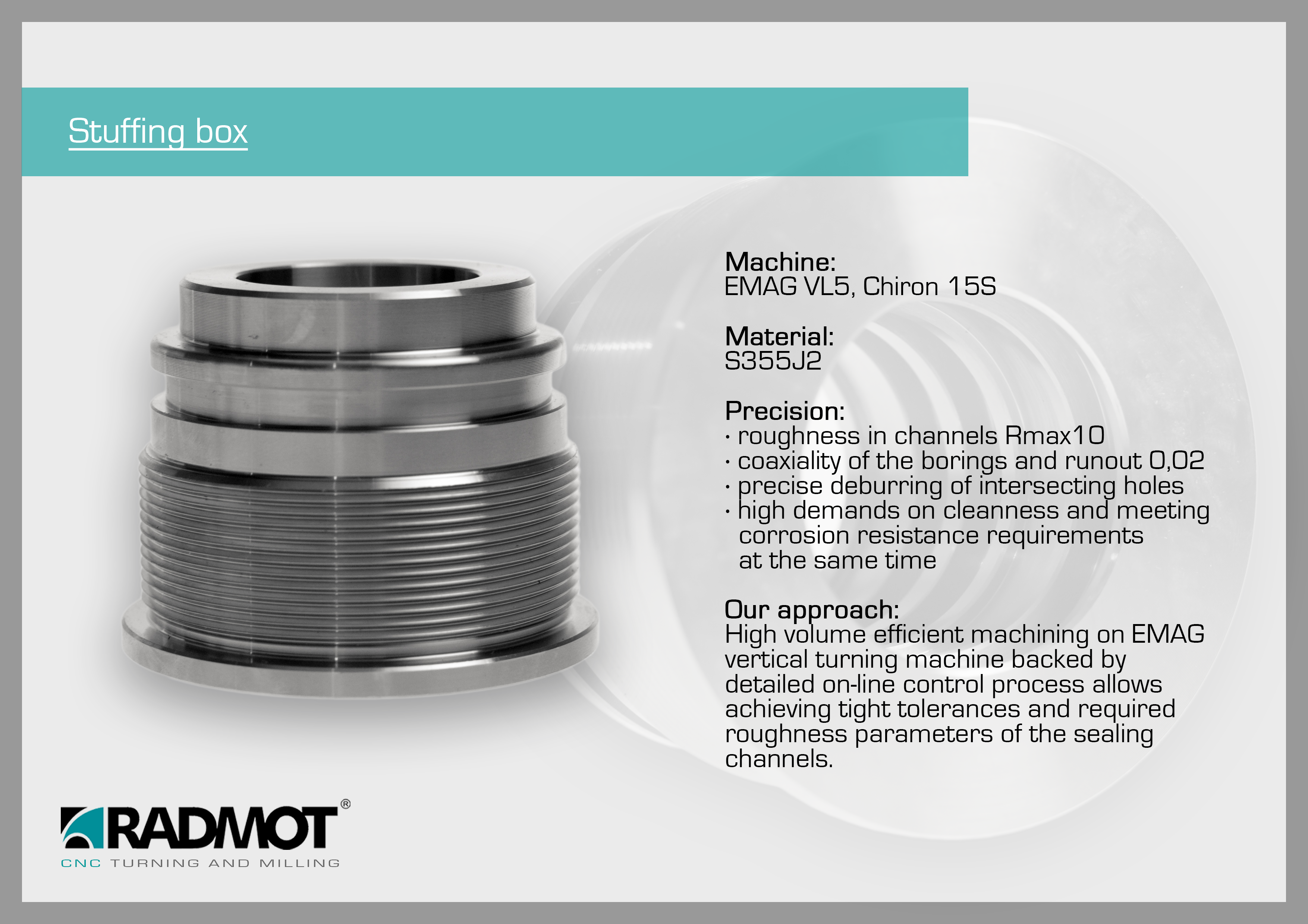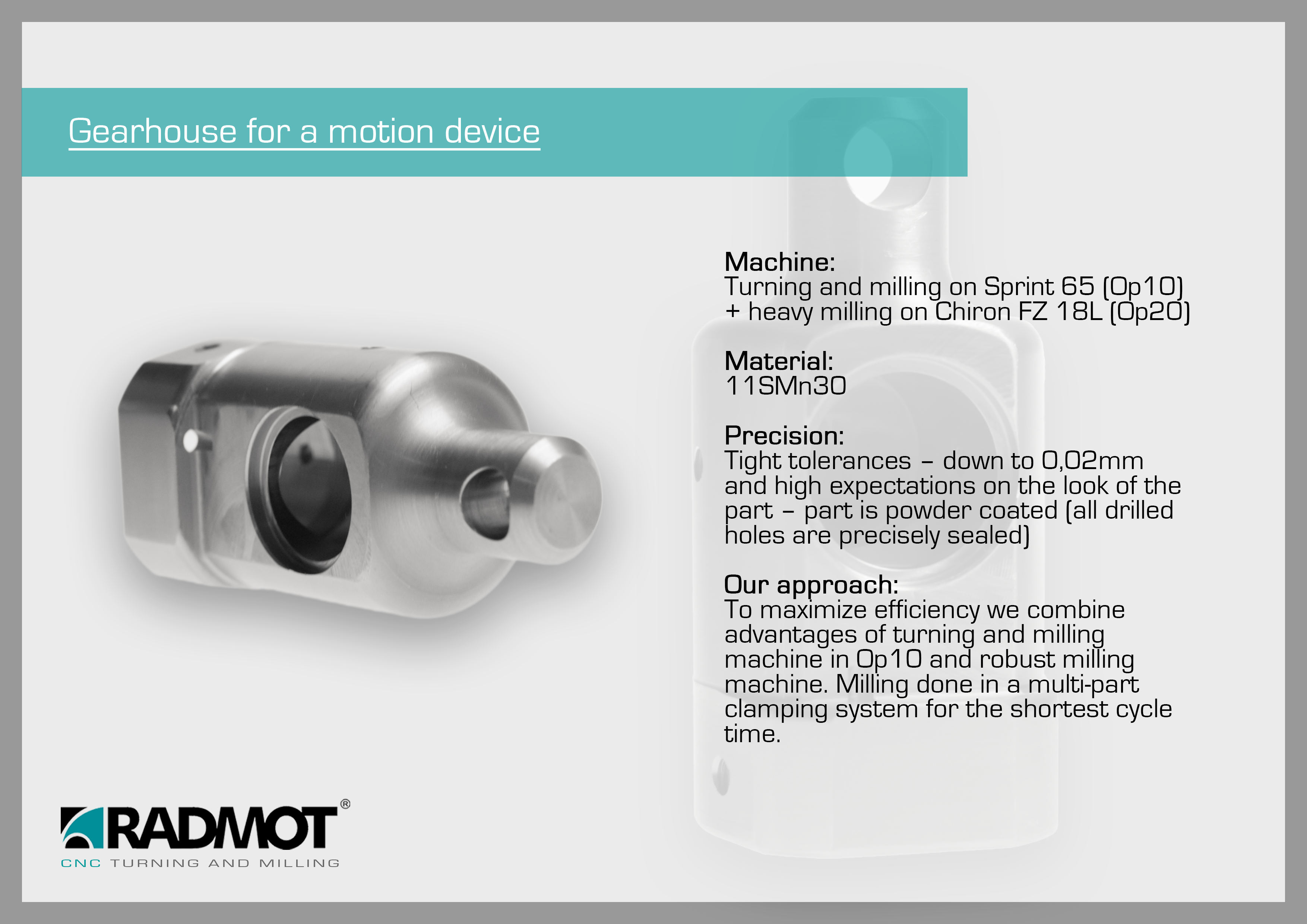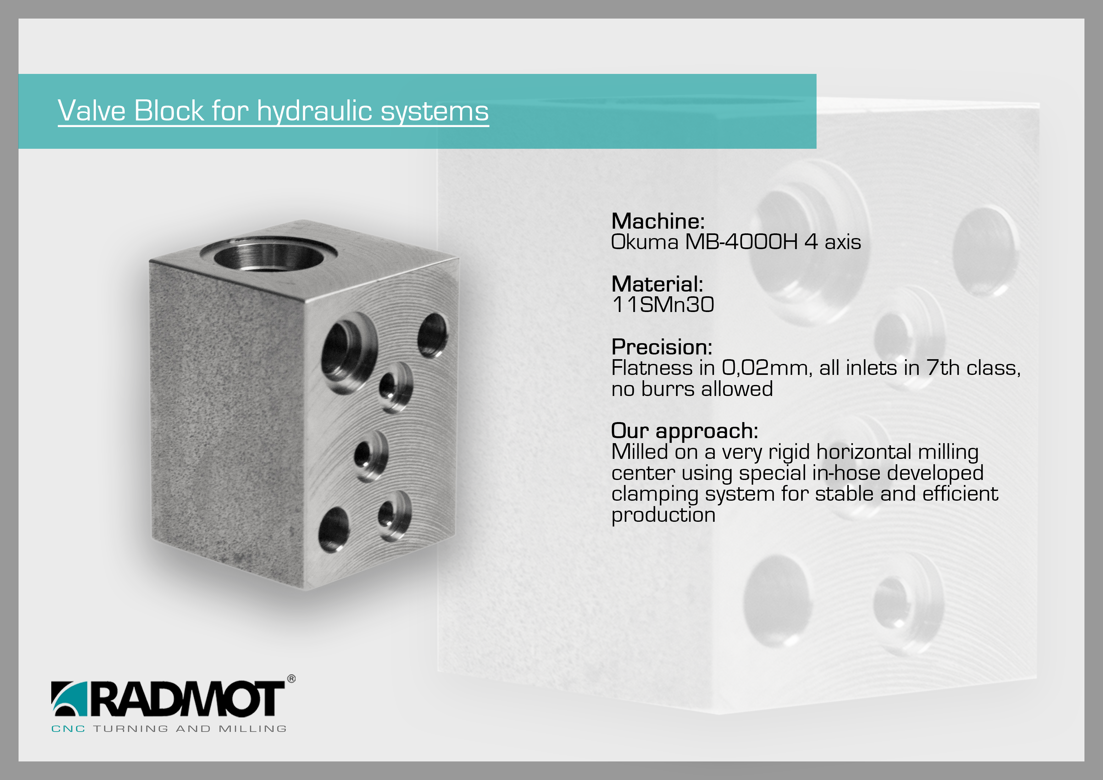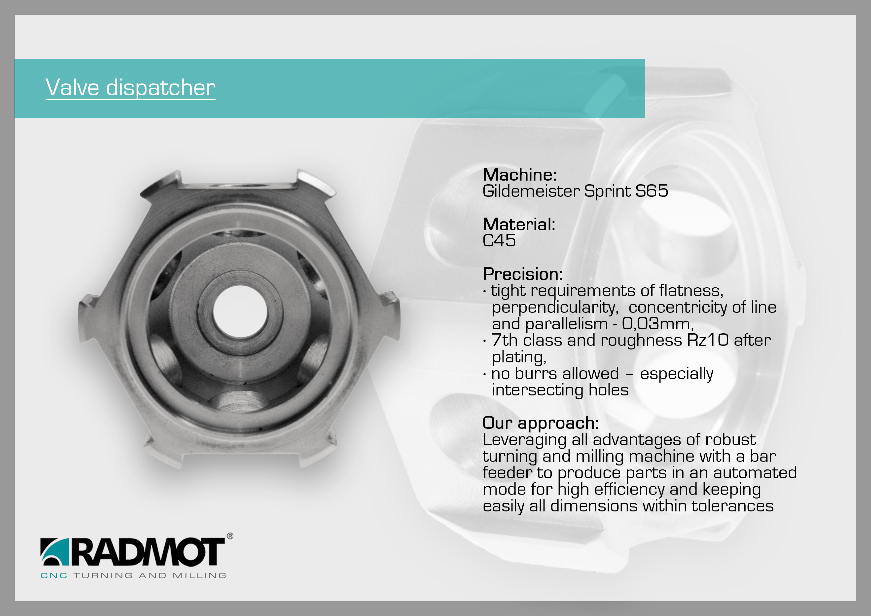 Firma RADMOT specjalizuje się w seryjnej produkcji części metodą obróbki skrawaniem CNC. Dostarczamy produkty najwyższej jakości do wielu gałęzi przemysłu: